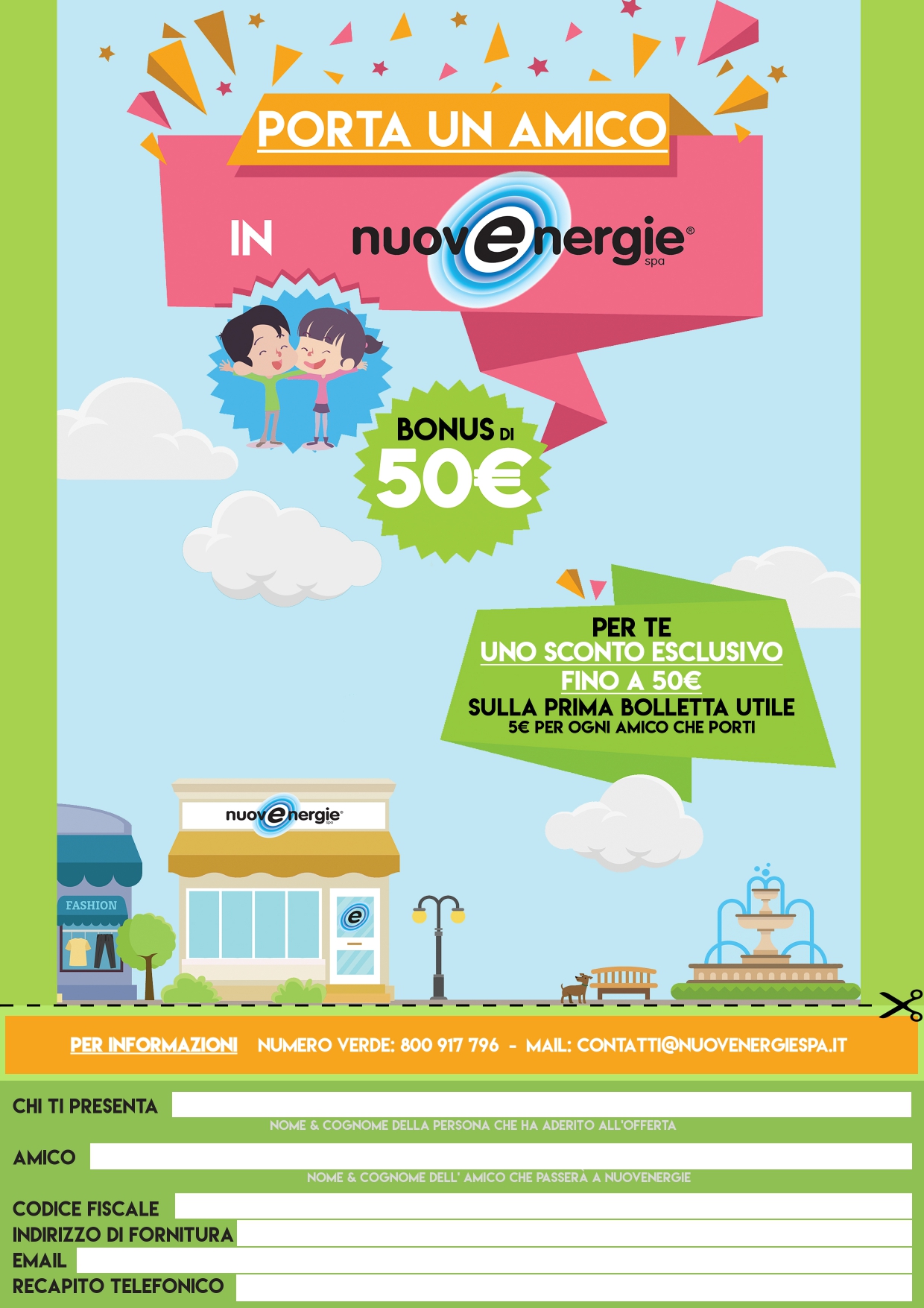 Invita i tuoi amici a sottoscrivere con Nuovenergie un contratto per la fornitura di gas o energia elettrica: riceverai subito 5 € di sconto per ogni amico che ha sottoscritto il contratto (fino ad un massimo di 10 amici). Se il tuo amico diventa cliente Nuovenergie, riceverai un bonus nella prima bolletta utile dopo l'effettiva adesione del tuo amico. Qualora l'attivazione della fornitura non vada a buon fine lo sconto di € 5,00 verrà recuperato alla prima fattura utile. REGOLAMENTO INIZIATIVA DESTINATARI E MODALITÀ DI PARTECIPAZIONE Possono partecipare alla promozione tutti